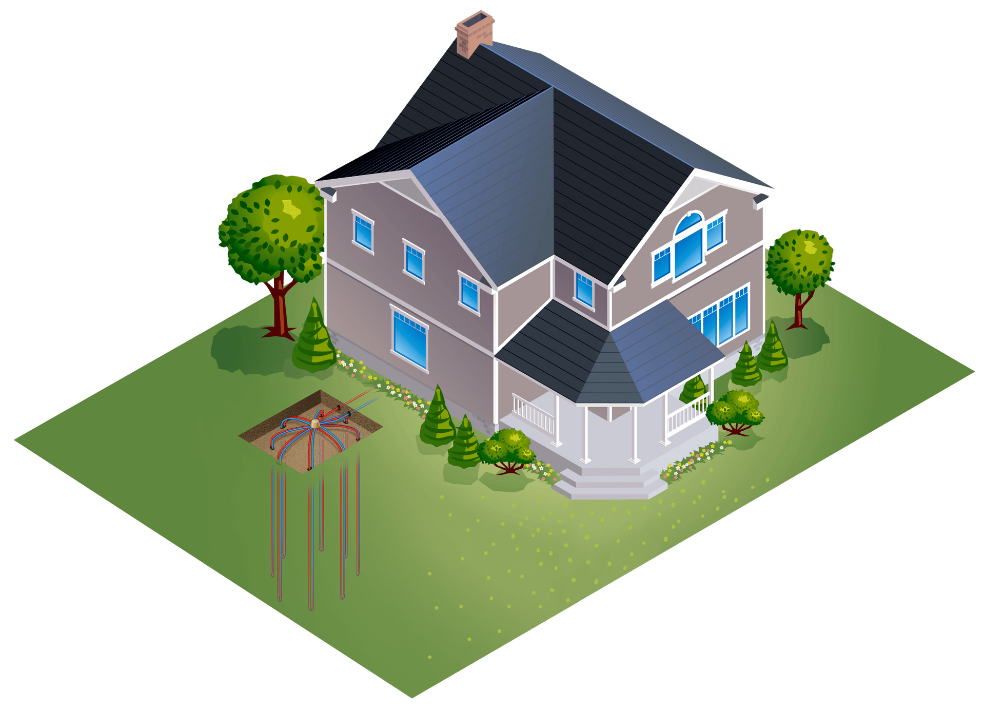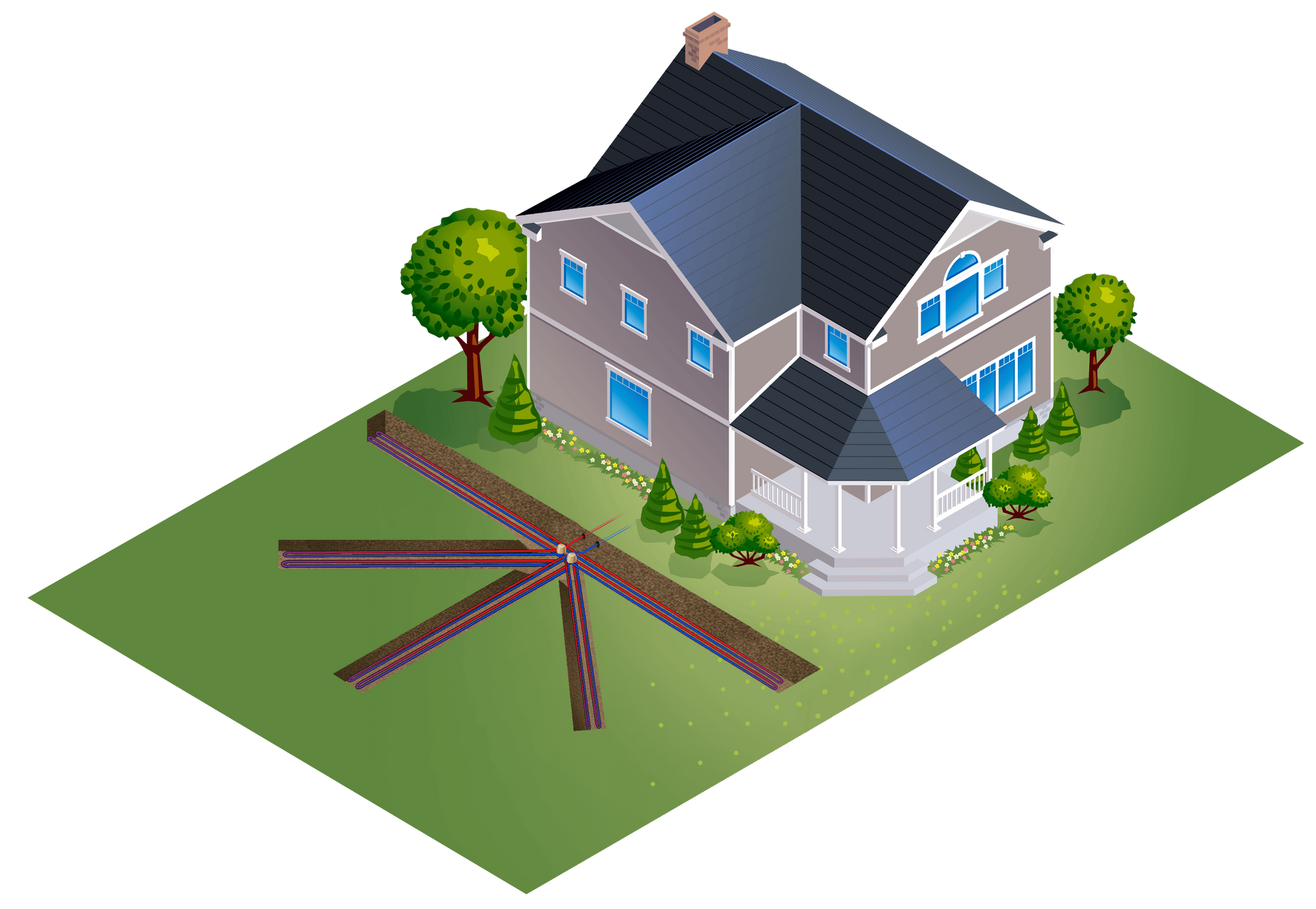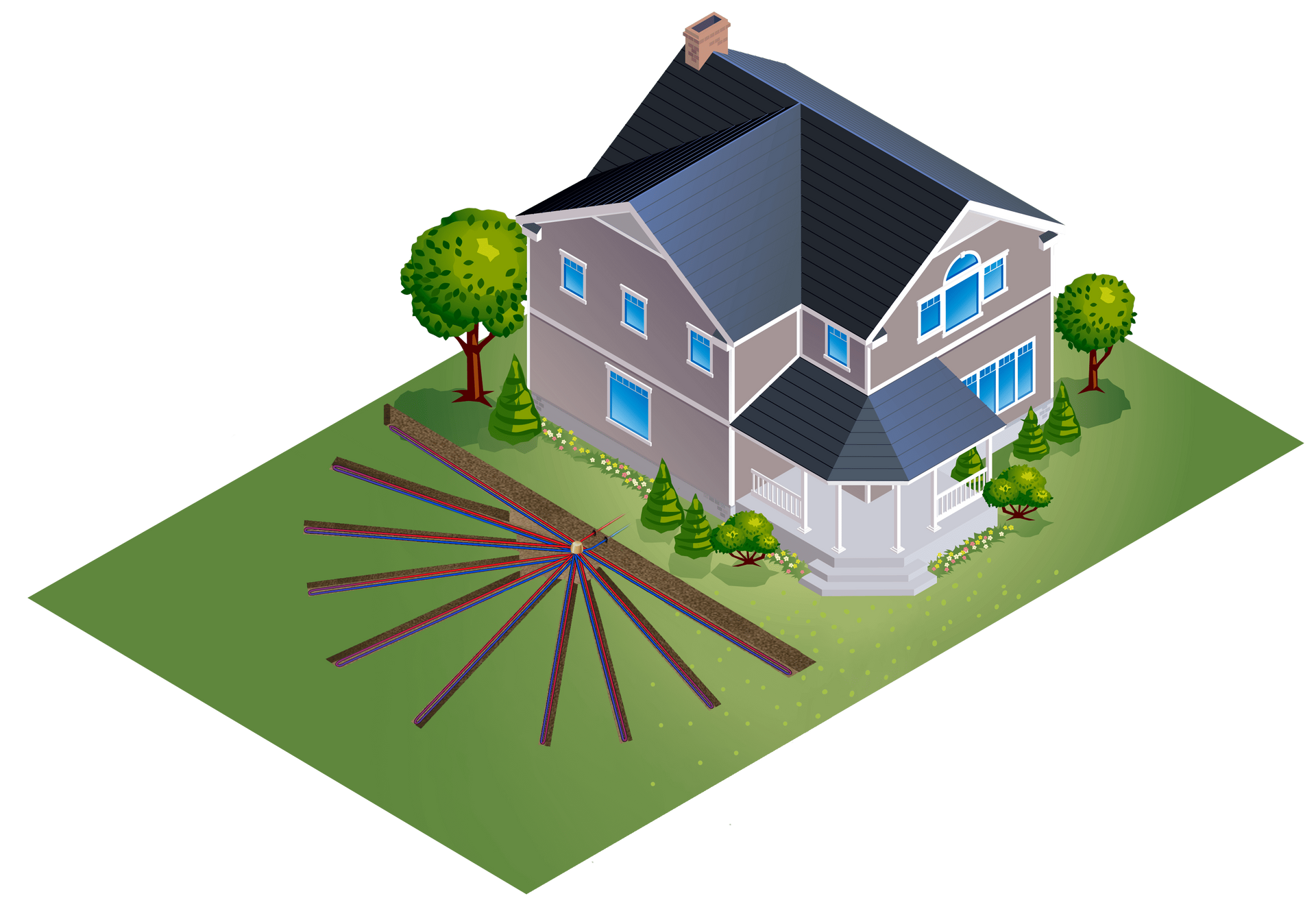 Often referred to as both a vertical and horizontal bore, the directional bore loop configuration combines elements of both designs. The loops typically extend 75 to 125 feet in various directions and are buried between 10 to 15 feet underground. While this setup requires a larger land area, it can be installed with minimal disturbance to your yard. The system uses 4 to 12 loops, spaced appropriately to allow for effective heat transfer from 15 feet below the earth’s surface. The loops are pushed into the ground, fanning out in a hand-shaped pattern before returning to the house at a single point.
